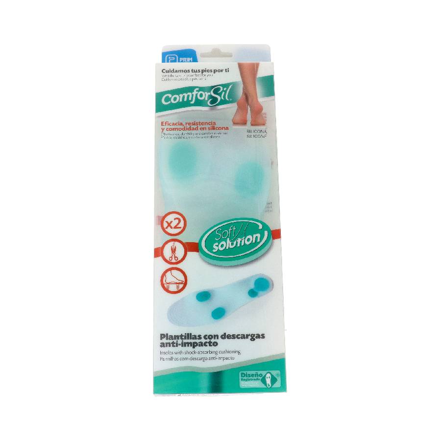 Plantillas con descaras anti-impacto. Fabricadas en dos densidades absorben impactos y los choques contra el suelo al caminar, proporcionando alivio y confort al evitar la presión en la zona del talón y los metatarsos. Especialmente indicadas para pies cansados, débiles y delicados.